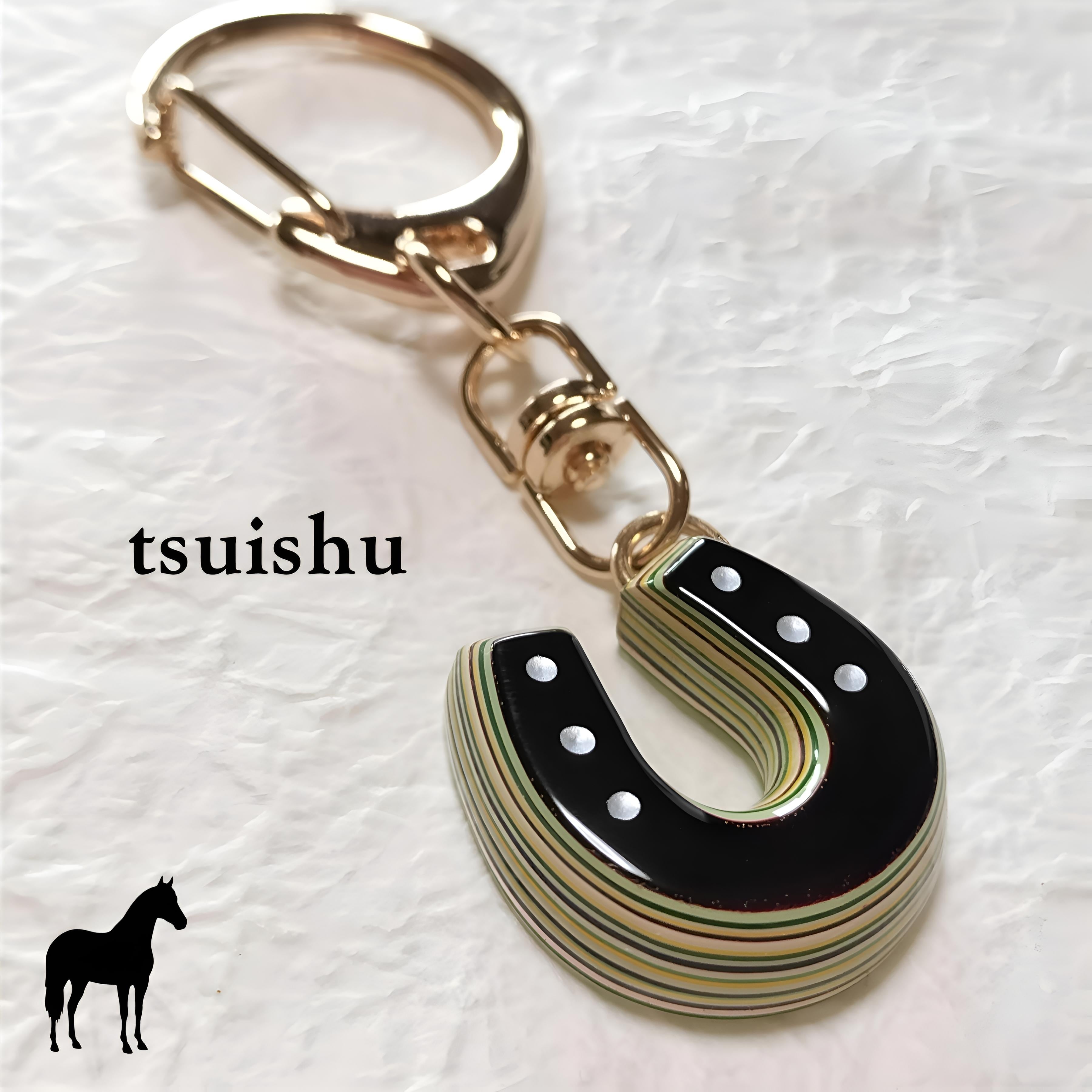 堆朱(ついしゅ)の馬蹄形キーホルダー 黒緑★開運★ HORSE SHOE